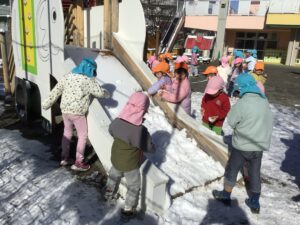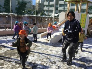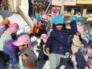 園庭に積もった雪を眺めて「雪だるま作りたいね」「ぼくは、雪合戦したいな~」と話していた子ども達。「園庭に行くよ~」と声をかけると“待ってました!”とばかりに猛スピードで身支度を済ませ、飛び出していきました。