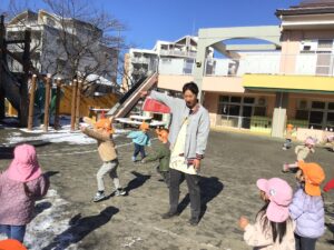 雪玉を作って友だちや保育者に当てては大喜び。当てた子も、当てられた子も笑顔になって、冬ならではの遊びを満喫しました。
