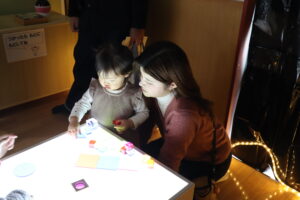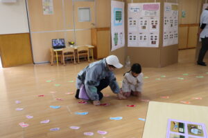 保健の「鼻かみ練習風船コーナー」では、風船で行う鼻かみ練習を、親子で真剣に取り組んでいました。