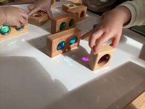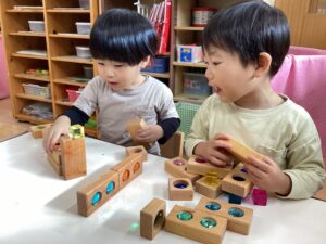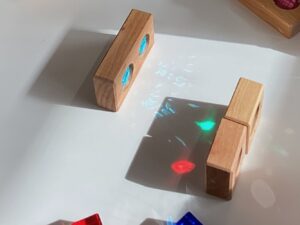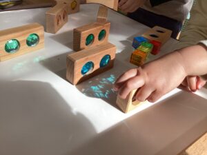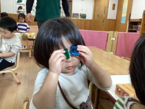 光の反射が探求できる積み木で遊んでいると、差し込んできた光によって様々な色が机に反射していることに気が付きました。「キラキラ!」「これは赤だ!こっちは青!」透明な積み木は色が透けて光がしっかりと出てきます。太陽に雲がかかり光が消えてしまうと、「あれ?」と積み木をじっと見て不思議そうな表情をしていました。積み木で遊ぶ中で光や色を感じながら、変化を楽しんでいました。