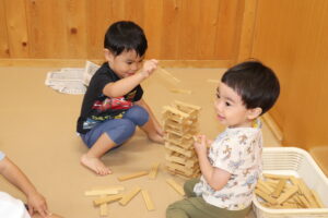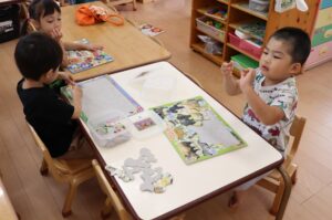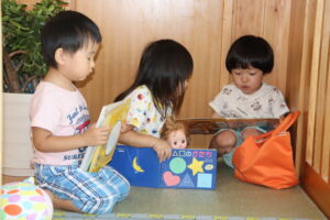 「赤ちゃんにご飯をあげよう」と、食べ物を準備したり、「これ、なーんだ?」と、絵本を指して答えを言い合うなど、可愛らしい関わりが見られます。