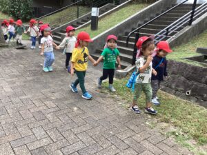 ひだまり公園まで散歩に行きました。友だちと手を繋いで歩いていると、途中でどんぐりが落ちていたり、地域の方に手を振って貰ったりと、いろいろな発見や出会いがありました。