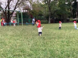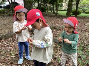 公園では、両手いっぱいにどんぐりを拾ったり、ブランコをしたり、鬼ごっこをしたりとたくさん身体を動かして遊んだので、帰り道「楽しかったね~」と嬉しい声が聞こえていました。