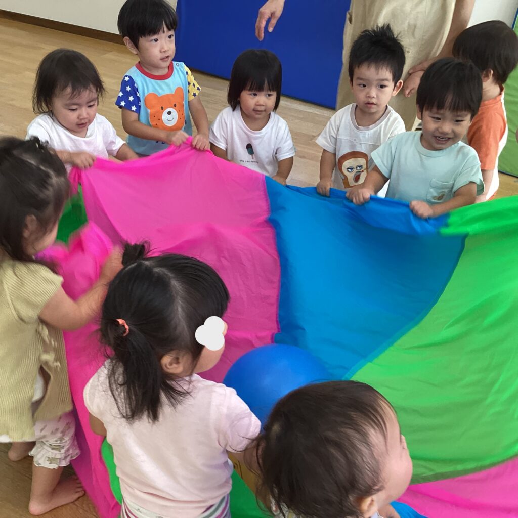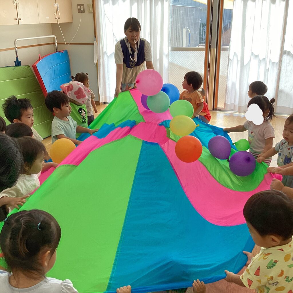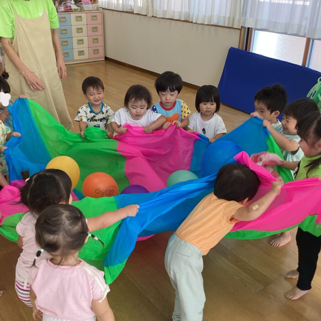 室内に戻り室内用の小さなパラバルーンを持ってくるとお兄さんお姉さんの真似をし始めました。両手でパラバルーンを掴んで上下に動かすとバルーンの上の風船が舞い上がると「うわぁ」「きれいだね~」と大興奮!皆で一緒に輪になって楽しく遊びました。
