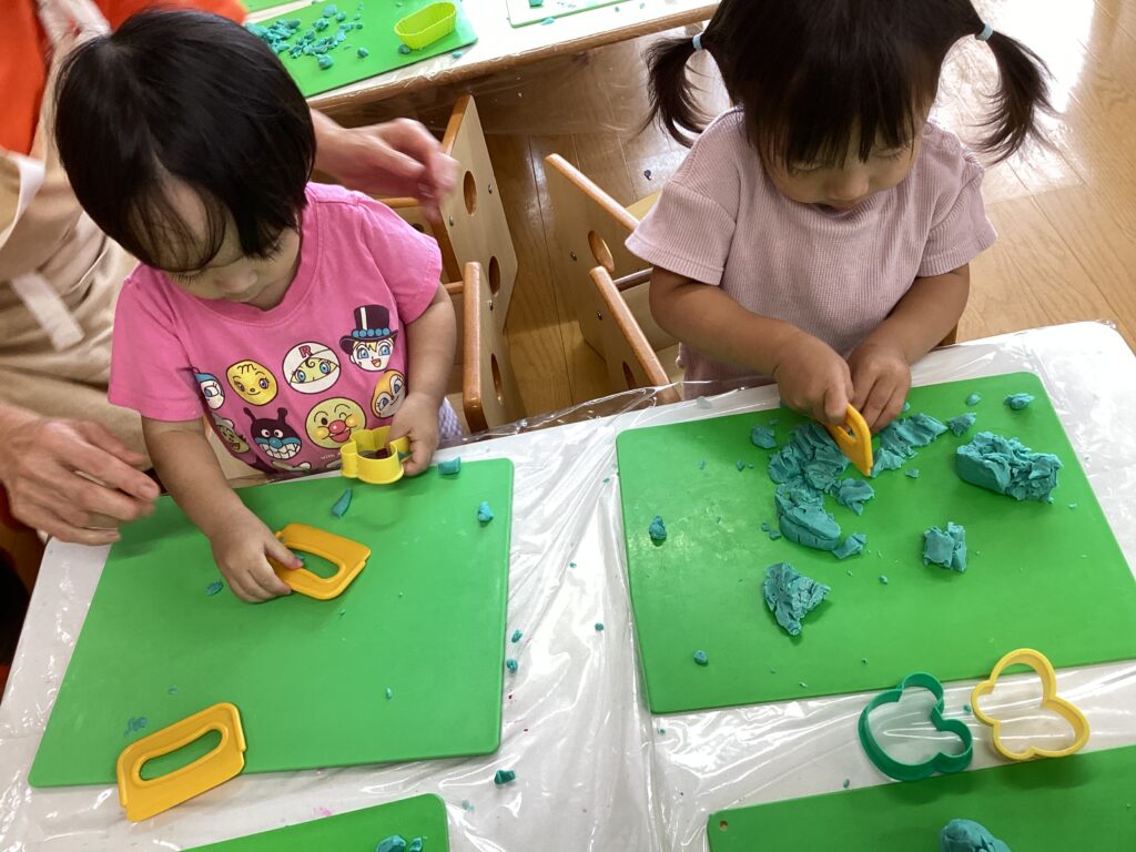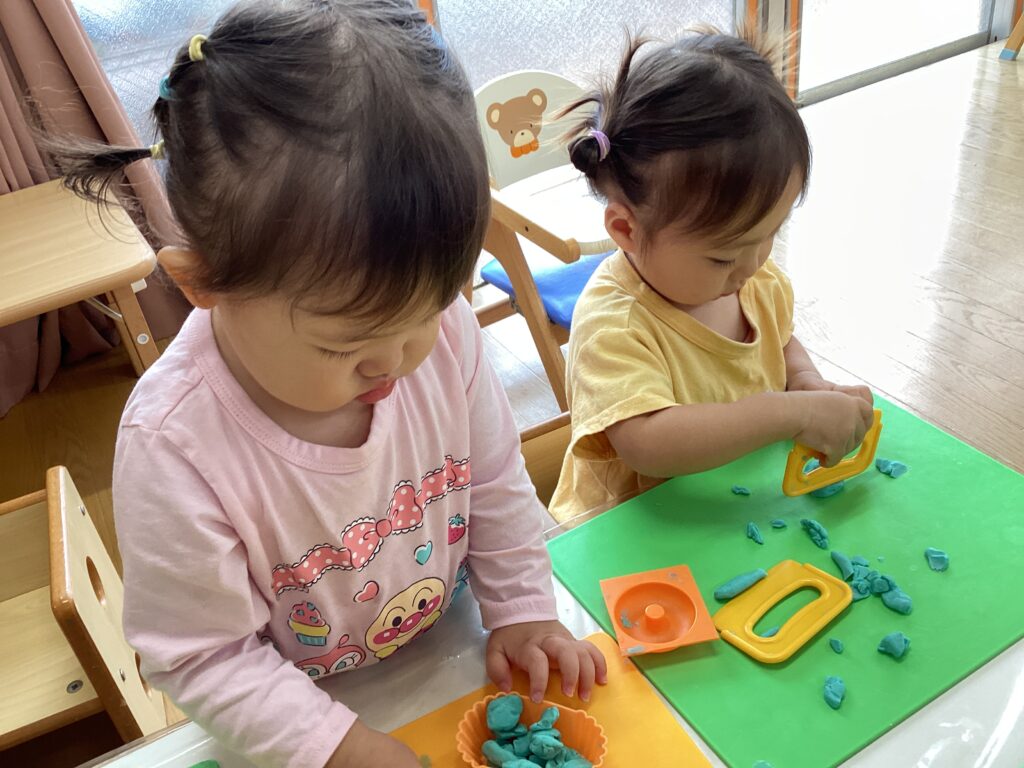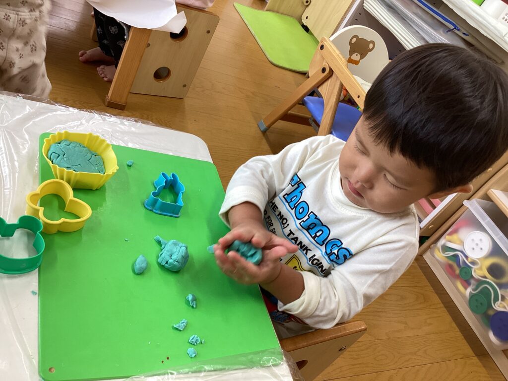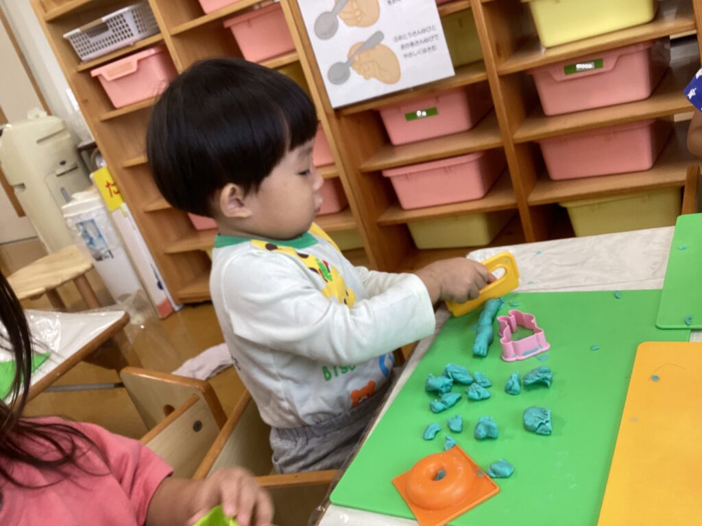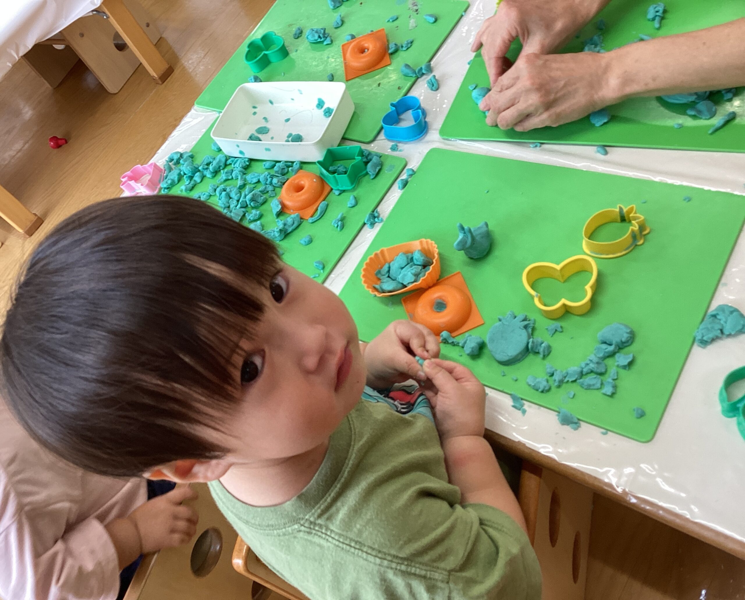 粘土遊びをしました。粘土を丸めたり細かくちぎったりして遊んでいました。型はめや粘土カッターなど初めて使う粘土用の道具に「これなに?」と大興奮。「やる!」「やりたい!」と興味津々に手に取っていました。遊び方を見せながら説明すると、子どもたちは工夫しながらそれぞれの粘土遊びを楽しんだようです。
