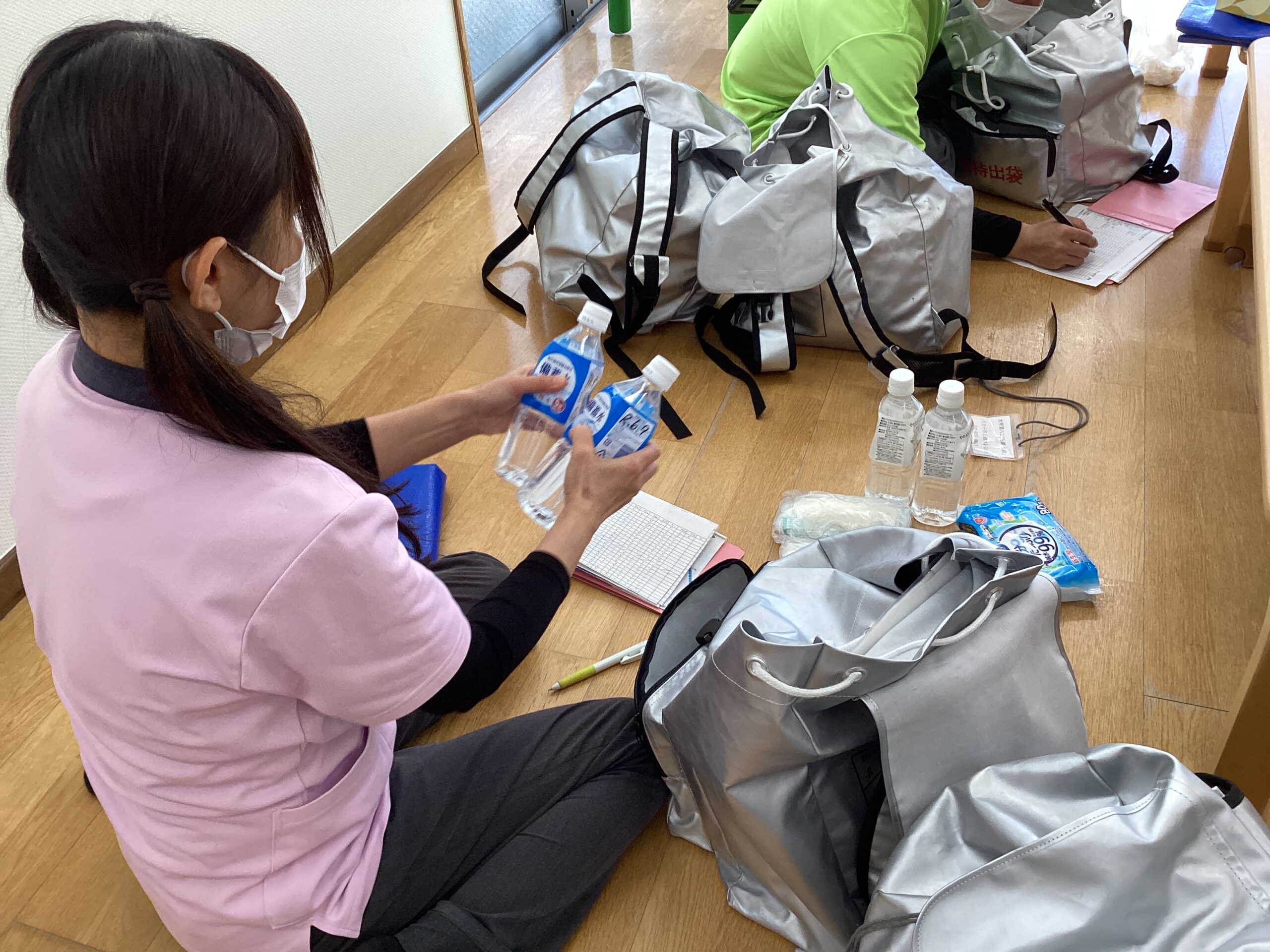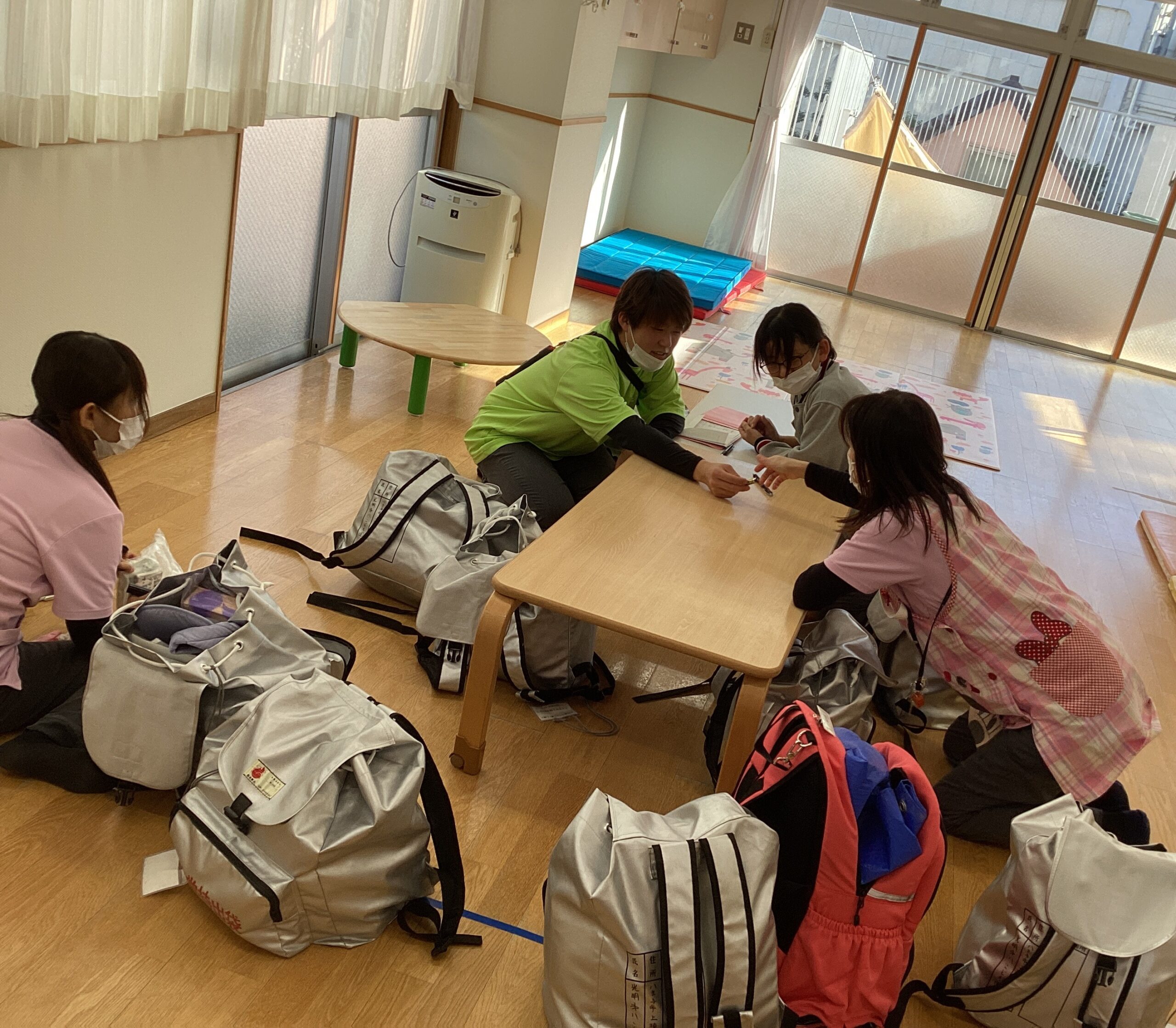 避難訓練後、防災リュックの中身を点検しています。備蓄水やオムツ、着替え等、定期的に見直しを行い、使用期限などを確認し災害時時に対応できるようにしています。同じ職員が点検するのではなく、全職員が防災に意識が持てるように交代で行っています。