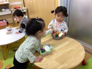 1歳児輝組の保育室に遊びに行きました。純組のお友だちだけで遊ぶ機会はなかなかないので、ままごとや絵本など興味を持った玩具で楽しそうに遊ぶ姿が見られました。少しずつ新しい環境に慣れ、新年度も子どもたちが楽しく過ごせるようにしていきたいと思います。