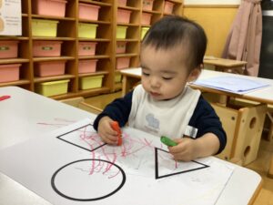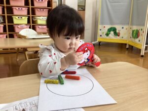 色や感触を楽しむ「なぐり描き」や「手形・足形」といった感覚遊びを行い、表現として行っています。