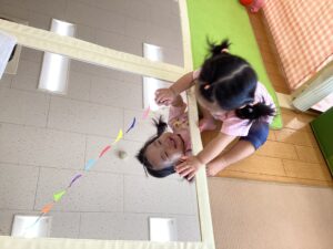 鏡越しに友だちも見えるので、更に好奇心が高まります。