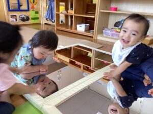 「ばぁ!」と言うと、鏡の中の子も『ばぁ!』とビックリした顔になるので面白がります。