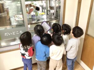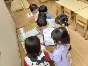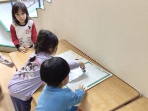愛組(3歳児)から、「栄養表のマグネット貼り替え」を心組へ引き継ぐ姿が見られました。 少し緊張していた心組も、年上のお友だちに優しく教えてもらいながら、色ごとにマグネットを貼り無事に完成。
