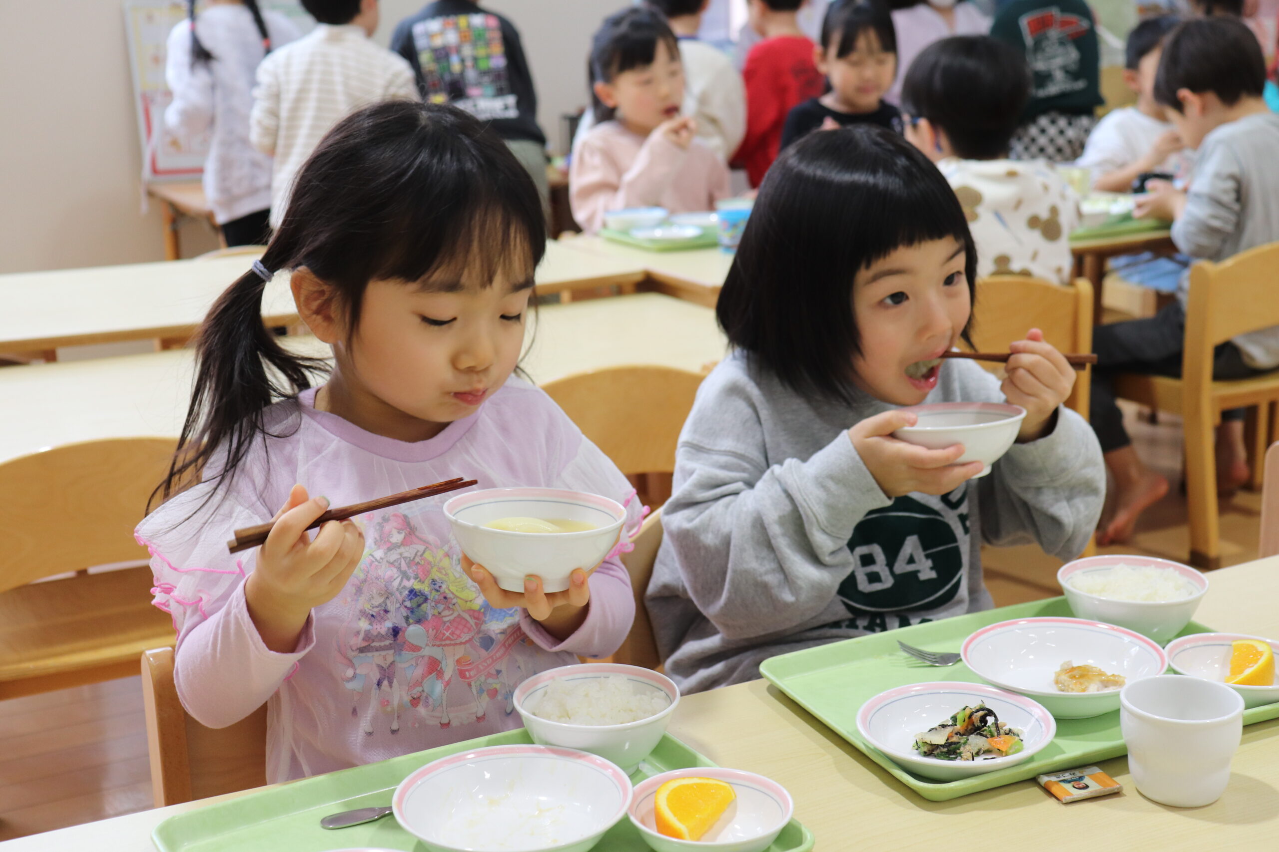 給食では自分のチームの味噌汁だけではなく他のチームのも味見をし「おいしい!」と言いながら楽しく食べていました。