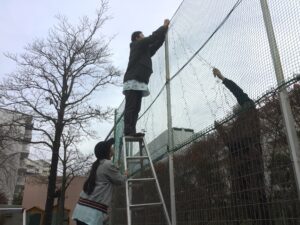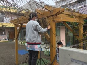 保育者が軒先の飾りつけを行っていると、子どもたちは「見て!」と指さしていました。キラキラした飾りに興味津々!!子どもたちと一緒にイルミネーションを見られる点灯式が楽しみです。
