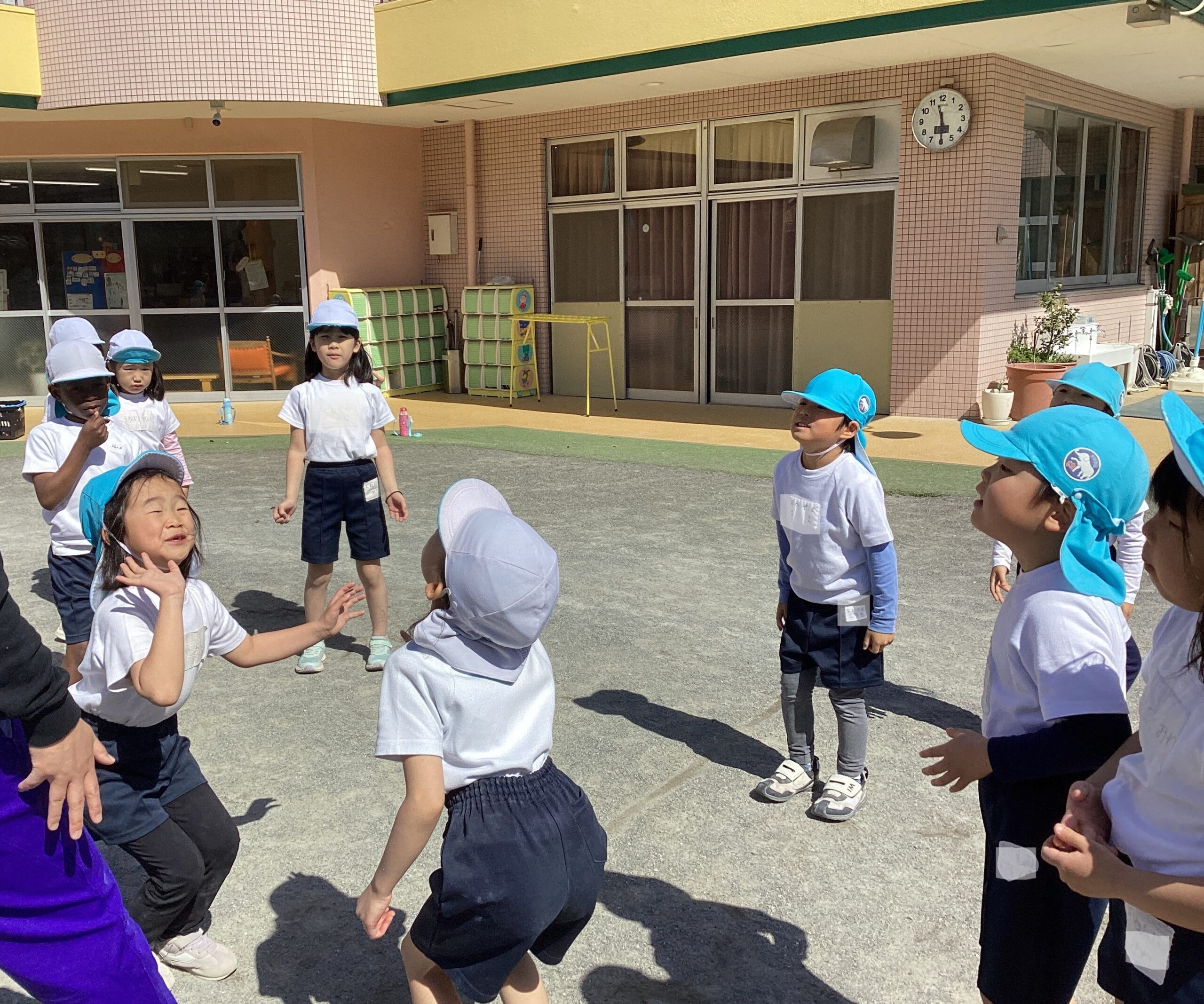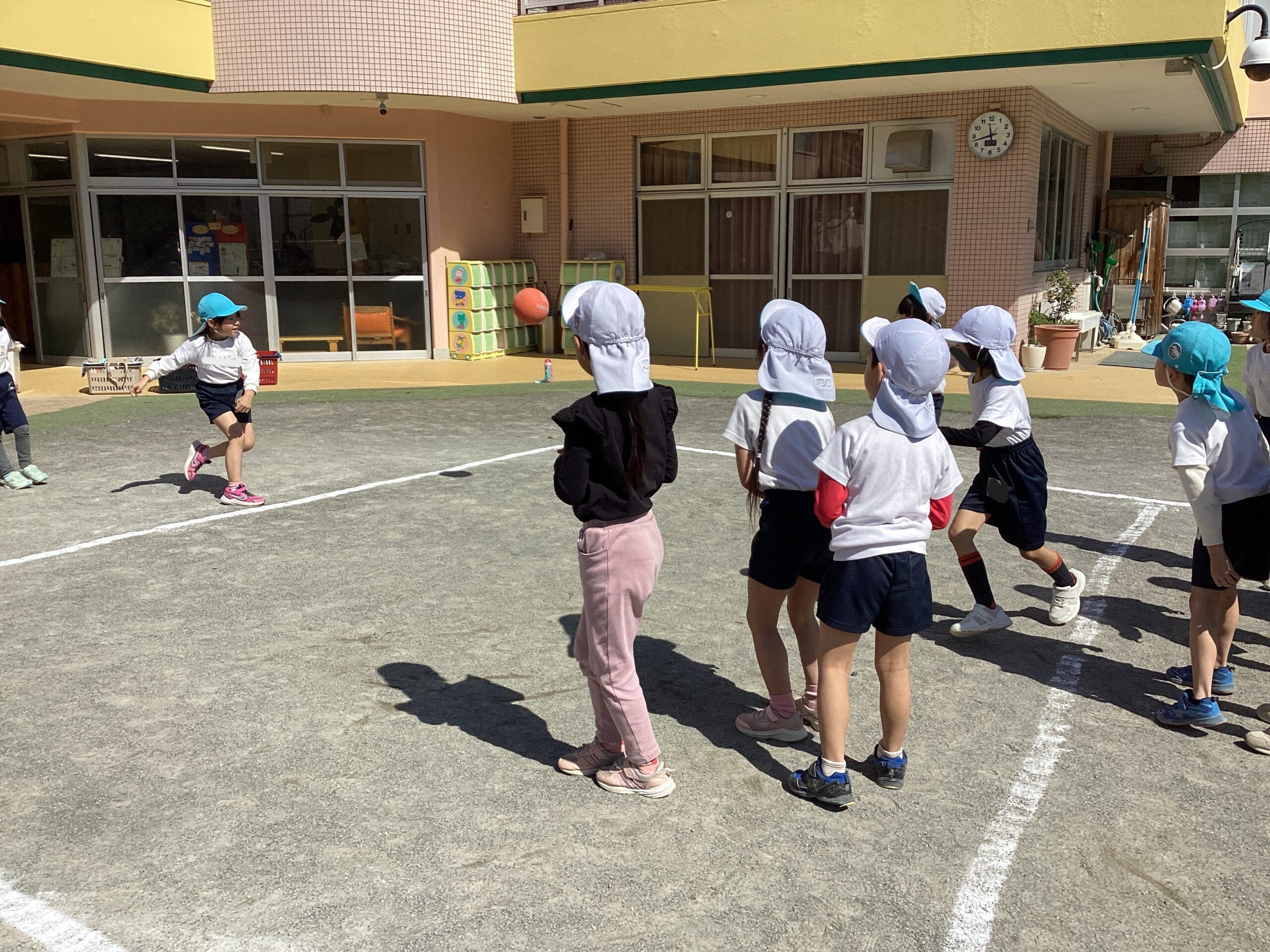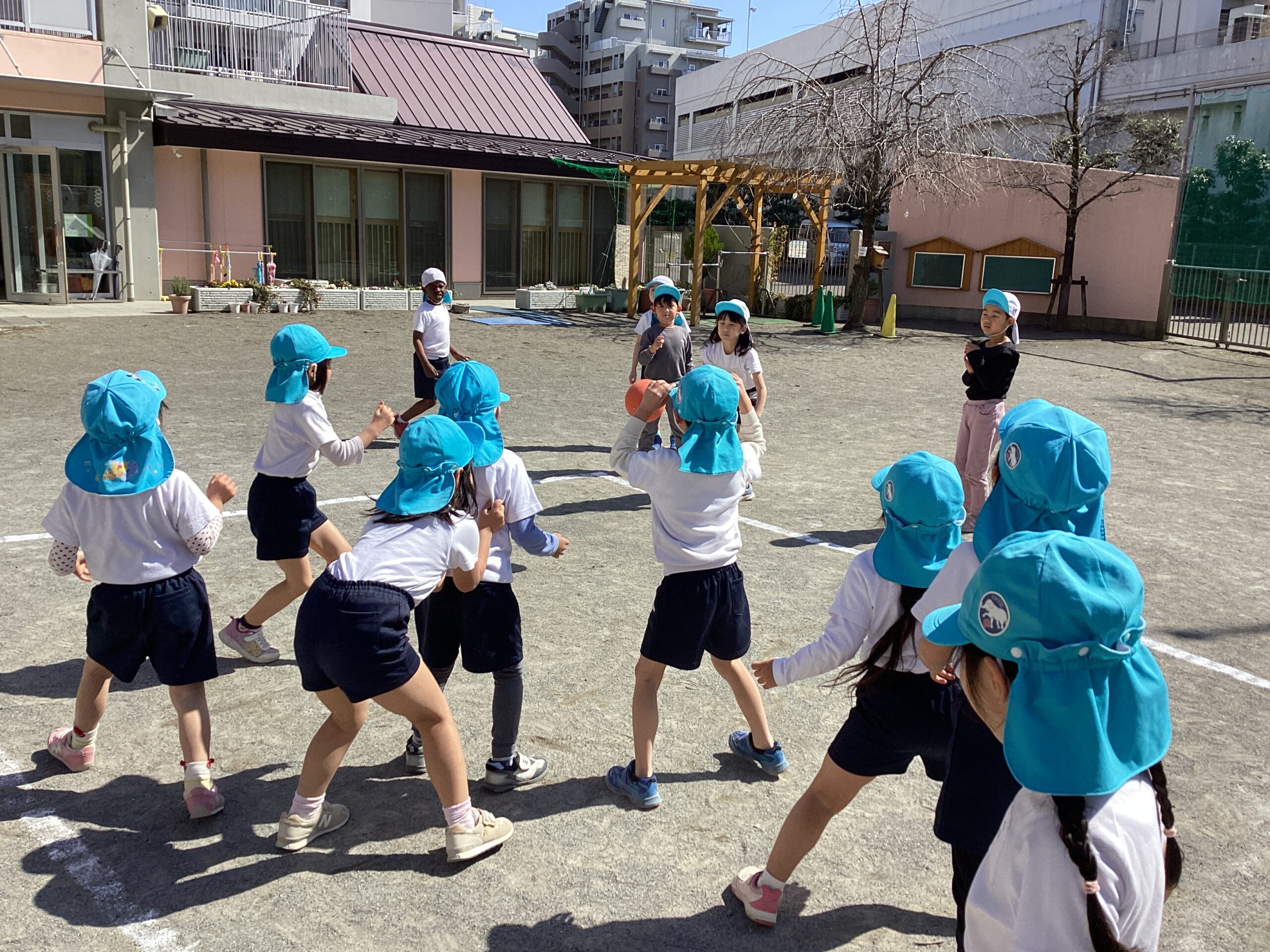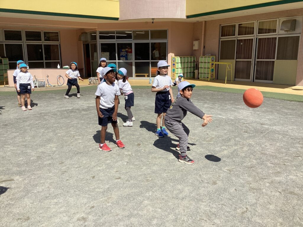 5歳児クラスではドッジボールが大流行。今日も「ドッジボールやりたい!」という声が上がり、青白チームに分かれて試合をしました。
