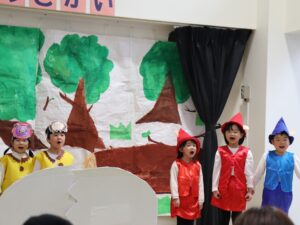 幼児クラスは、お兄さんお姉さんが年下の子を気にかけながら話を進めたり、台詞だけではなく体を使って表現するなど、日常の子どもたちのやり取りが見られたのではないでしょうか。
