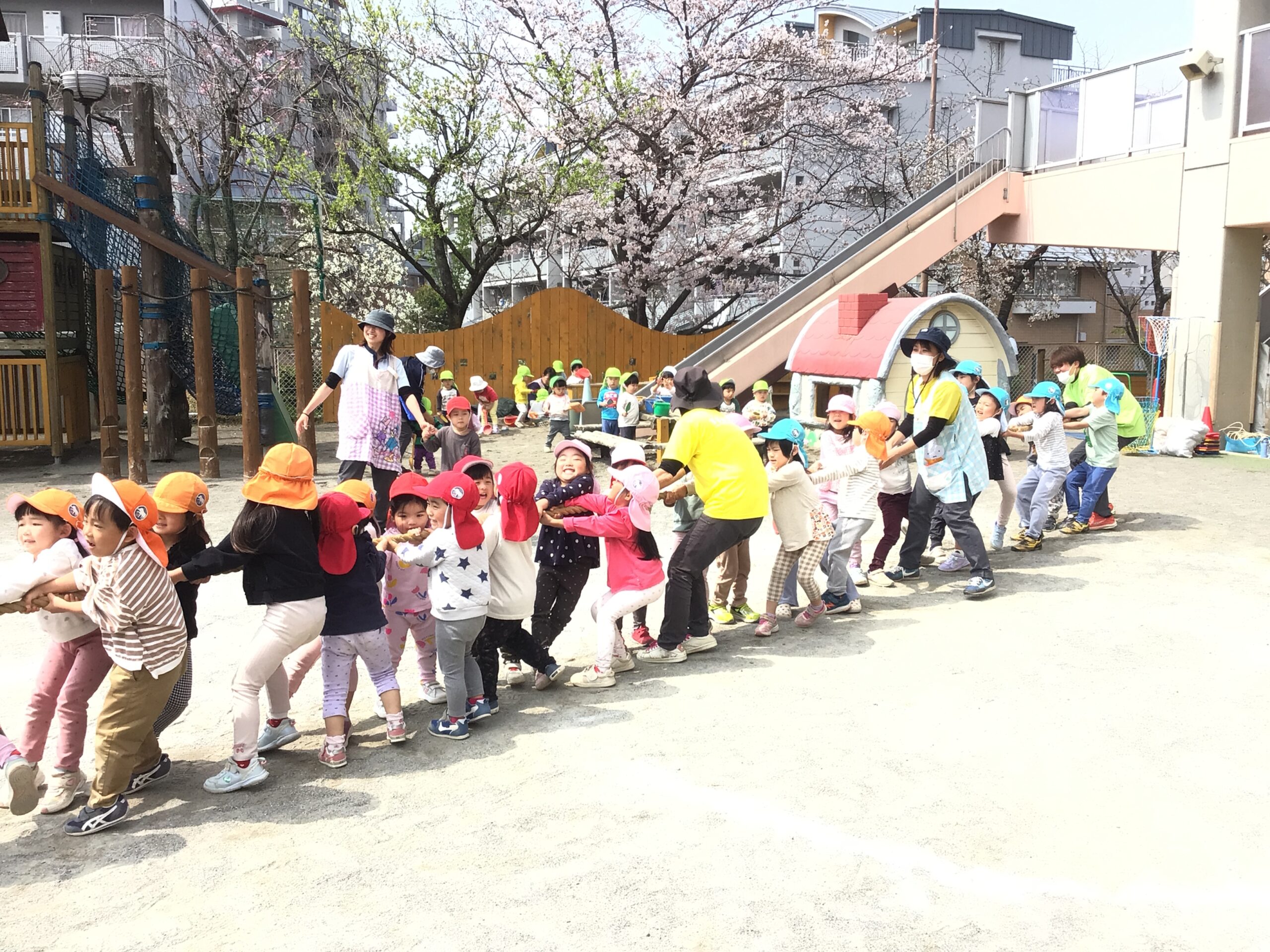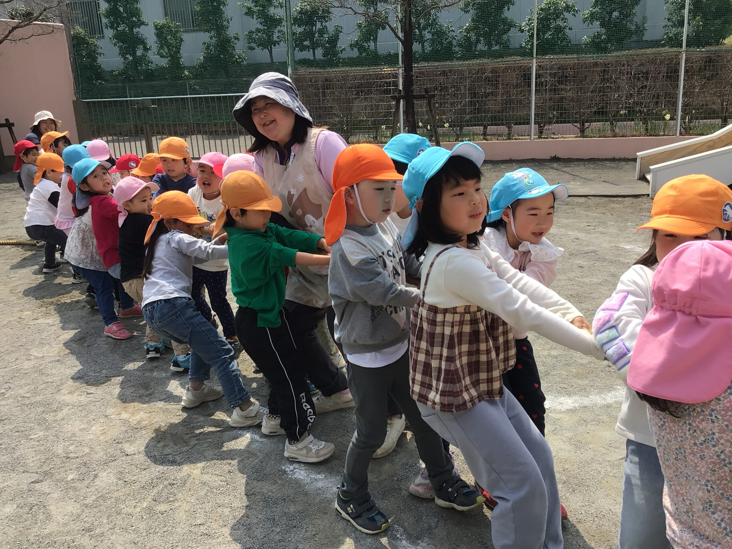 青空の下、今年度最後のチーム対抗ミニ運動会を行いました。始まる前からチームでかけ声をかけたり、作戦会議をしたりして気合十分のこどもたち。心組もチームに入り、玉入れや綱引きをみんなで協力して頑張りました。