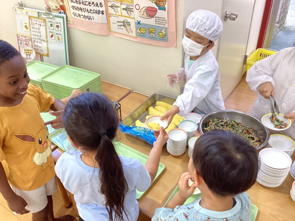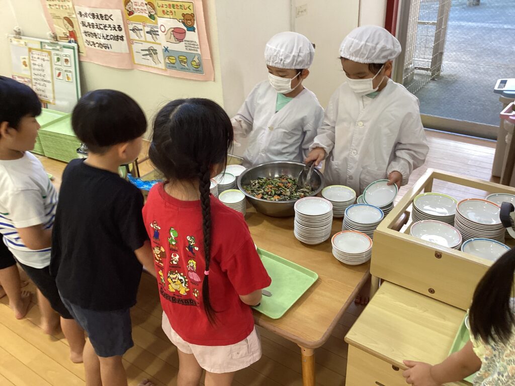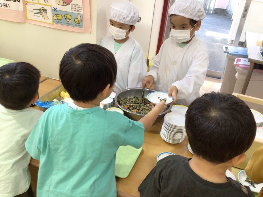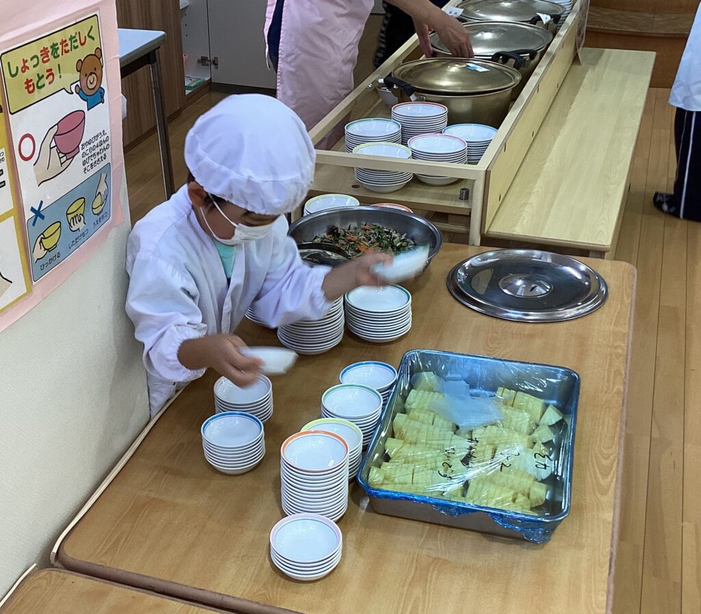 愛組の子に「これくらいなら食べられそう?」などと優しく声を掛けてあげることで、「それくらいなら食べられそう!」「もう少し少なくしてほしい。」など頼もしいお兄さんお姉さんが対応してくれています。