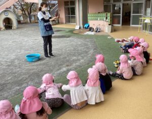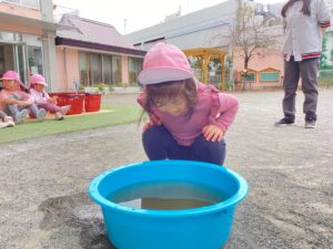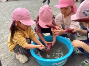 7日の芋ほりで大収穫だったさつま芋。大きなさつまいもを使って芋煮汁を作る事にしました。土のたくさんついたさつま芋を水洗いすると皮が見え「むらさき色になった」と驚く子どもたち。掘ってきた芋と見比べると「紫じゃないね」と話していました。なぜ色が違うのかと考え「土の下にできるから、土で汚れているんだ」と普段スーパーで見るさつま芋との色の違いに気づいたようでした。「色が変わった!!」「奇麗になってきた」「お水が汚くなってる」などと話しながら洗い、奇麗になったさつま芋をとても嬉しそうに見せてくれました。