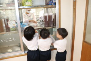 栄養表の貼りかえは愛組の子どもたちが担当しています。毎朝調理室に栄養表をもらいに行くと、「今日はグレープフルーツだ!」「鶏肉があるからたくさん食べて大きくなる!」など和気あいあいと話す姿が見られます。