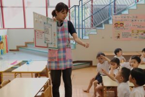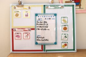 第八こども園では、その日の給食に入っている食材が体の中でどんな働きをしているのかという事を目で見て分かるよう栄養表を使用しています。