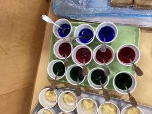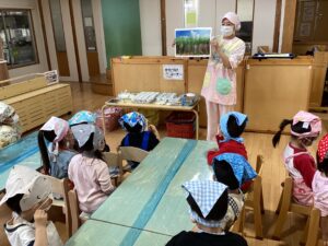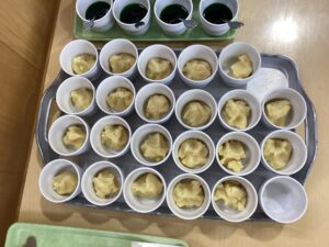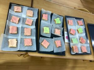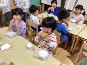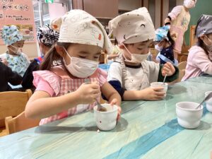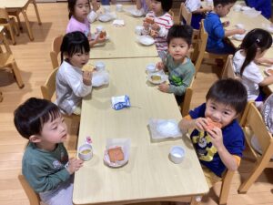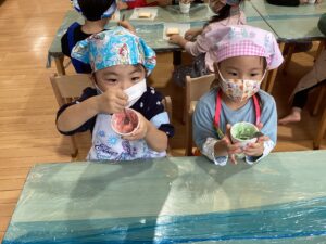 調理保育「メロンパン風トースト」作りでは家庭でも食べたことのあるメロンパンはどのように作るのかな?とワクワクしていました。「メロン、いちご、ブルーハワイ」の3種類から好きなシロップを選び、パンの上にのせるクッキー生地を作ります。「うわーピンクになってきた!!」「僕のは緑だよ!」など色の変化に興味津々でした。おやつの時間に焼きあがった自分達のトーストを「これ見て!私が作ったトーストだよ!」「美味しー!!」と友だちと見せ合いながら食べ、楽しい時間となりました。