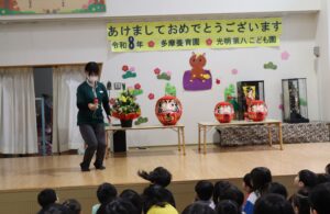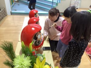 新年の集いを行いでは、だるまや干支についての話を聞いたり、お正月は家族でおせち料理を食べた事を話したりしてすごしました。また、子ども園のみんなが元気いっぱい過ごせる様にとだるまの目入れを行いました。お正月遊びにでは、来園された地域の方がお手玉の手本を見せてくれると子どもたちも教わりながら挑戦!!福笑いやこま等お正月遊びを楽しみました。
