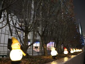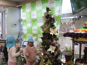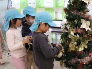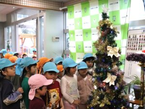 みんなで飾り付けをしたクリスマスツリーと園舎全体のイルミネーションの点灯式を行いました。「5,4,3,2,1,点灯!!」という子どもたちの元気な声とともにクリスマスツリーが輝くと「わぁー光った!」「きれいだね」などと子どもたちの会話が弾んでいました。「早くサンタさんこないかな?」と今からクリスマス当日が待ちきれない様子の子どもたちでした。
