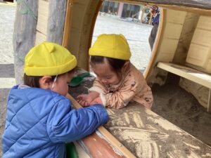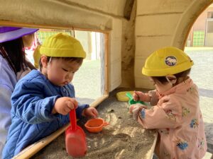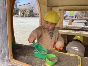 砂遊びが始まると以前は砂の感触を楽しむ事が多かった子どもたちも、周りの子の遊びを真似たり、砂を入れたカップを「どうぞ」と渡したりと