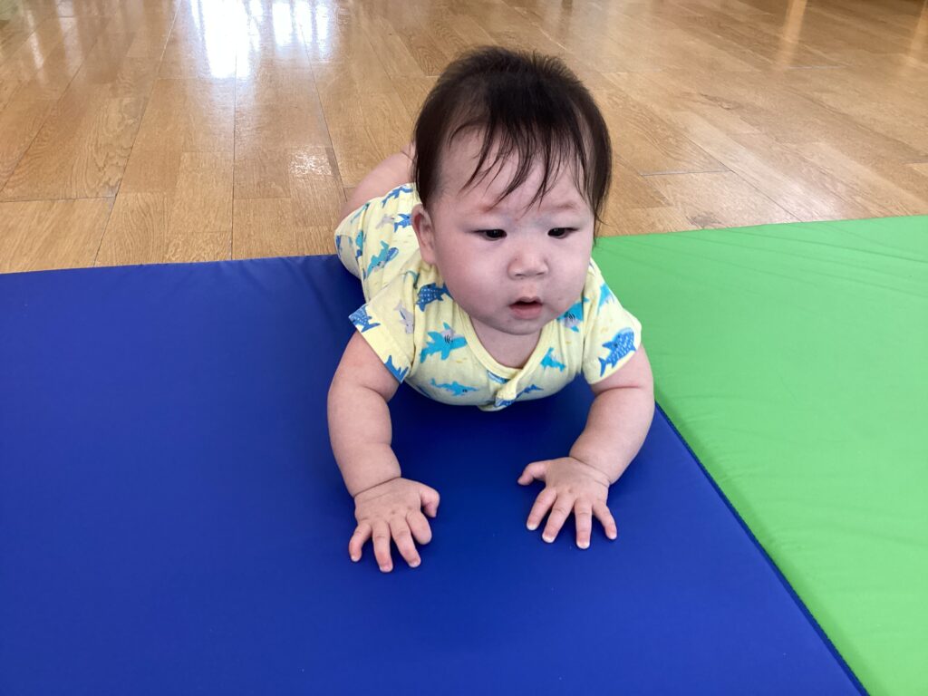 トンネルをのぞき「こっちにおいで」と声を掛けると、トンネルの中を元気にハイハイしてみたり、マットの上でゴロゴロと転がってみたり、身体をいっぱい動かして遊んでいました。可愛い笑顔がいっぱい見られました。