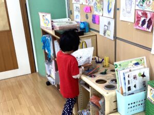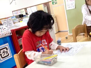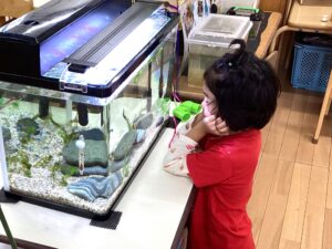 幼児クラスに遊びきた一時預かりのお友だち。大きな水槽の中で泳ぐ色鮮やかな熱帯魚に興味津々。また塗り絵や机上遊びが楽しくて給食の時間になっても「もっと遊びたい!」と時間いっぱいまで遊びを満喫していました。