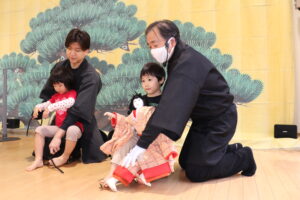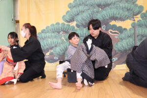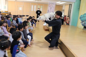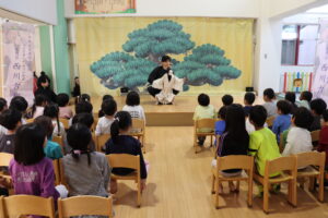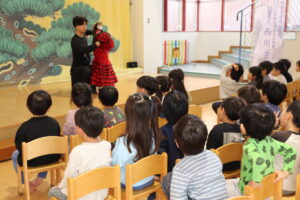 多摩養育園福祉大使であられる西川古柳座のお家元が来園し、車人形の公演をしてくださいました。「認定こども園せいび」のお友達と、地域の方もお招きし、賑やかな観覧となりました。箱車に座って人形を操る様に、子ども達の目も釘付け。まるで生きているかの様に、感情によって表情が変化する人形の姿に心を奪われている様でした。観覧中は、人形のおどける姿に声をあげて笑い、リズミカルな音楽に合わせて手拍子をする等、終始楽しんでいる様子がみられました。「人形に触ってみたい!」「箱車に乗りたい!」という声も多く聞かれ、迫力ある舞台に触れる事で、日本古来からの伝統芸能に興味を持つきっかけになった様でした。