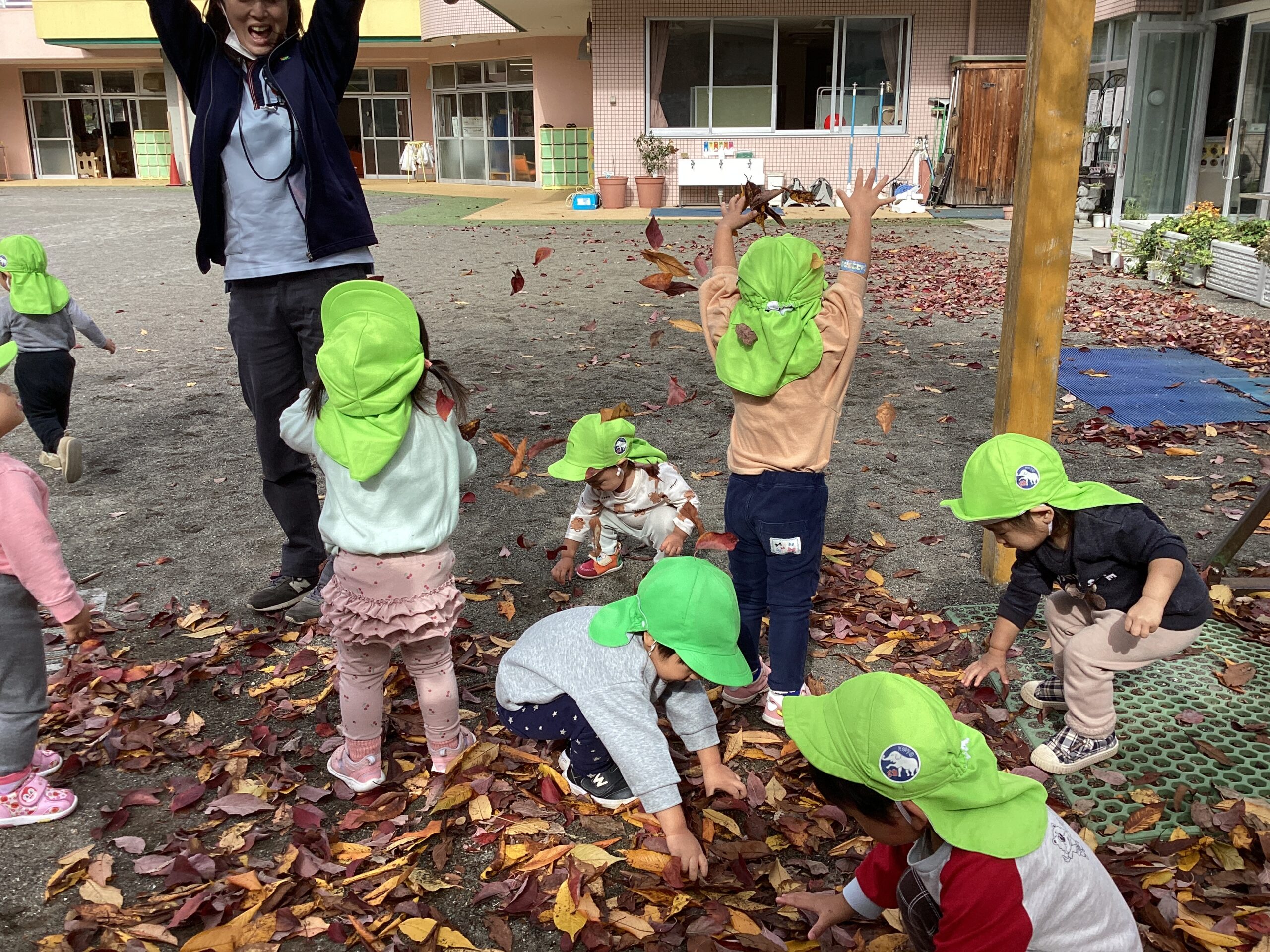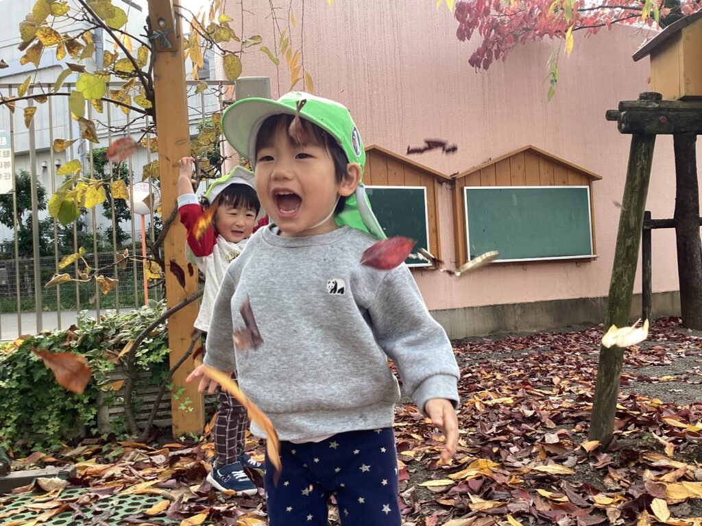 園庭にある木の下で赤や黄色の落ち葉を探したり、雨のように降らして楽しみました。「あか!」「きいろ!」と拾いながら色を言ってみたり、降ってきた葉っぱを空中で拾おうとする微笑ましい姿が見られました。これからも季節ならではの遊びを楽しんでいきます。