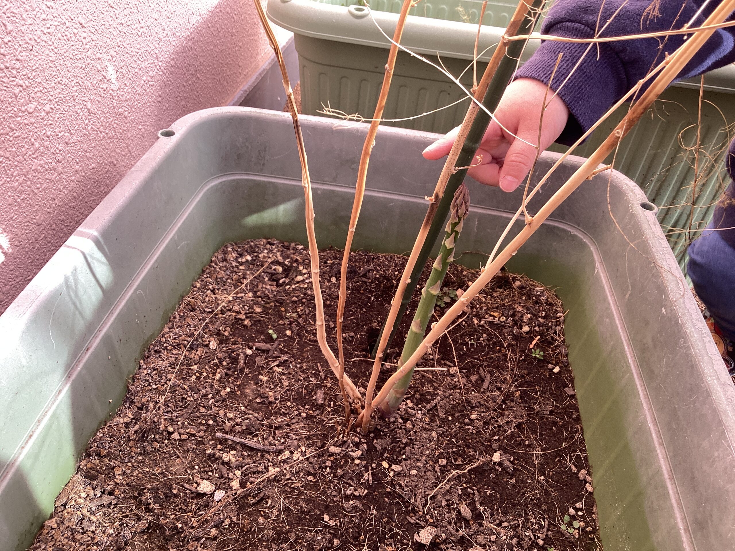 暖かい日が続いていたせいでしょうか。夏の間に植えたアスパラガスから、ニョキニョキと芽が伸びてきました。テラスで遊んでいると、アスパラガスの芽が出てきている事に気が付いた輝組の子どもたち。