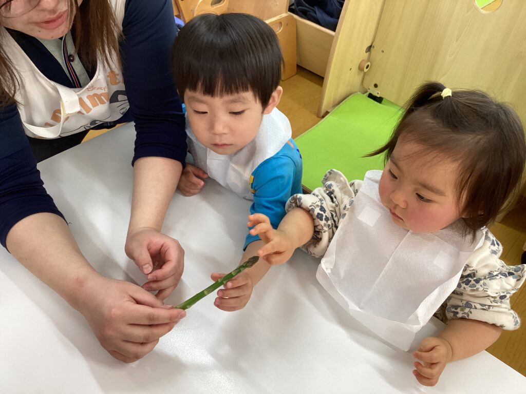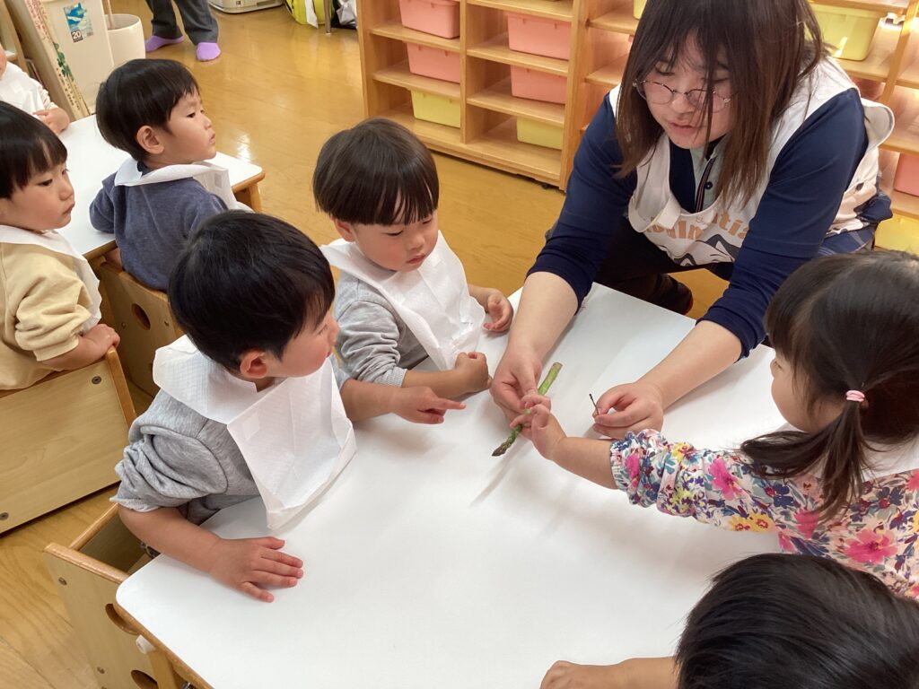 みんなでアスパラガスの芽にそっと触れたり、匂いを嗅いだりしていました。日々アスパラガスの世話をする事で、小さな変化に気が付いたのではないでしょうか。