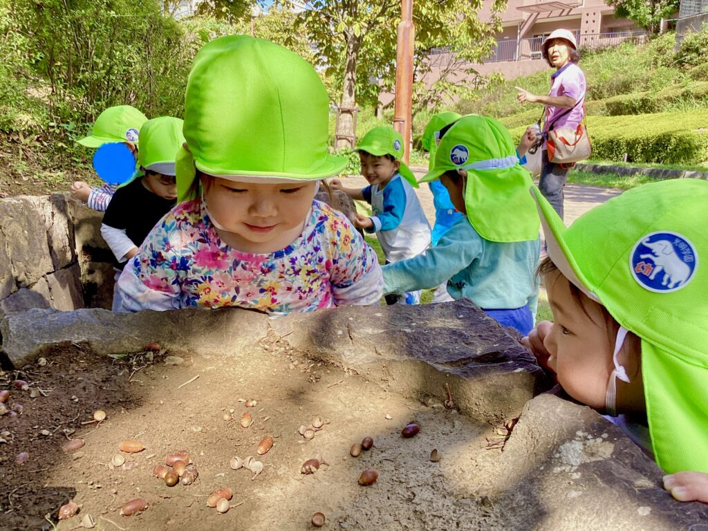 秋になりどんぐり等の木の実を沢山見かけるようになりました。大きいものから小さいものまで夢中になって探していました。どんぐり集めや落ち葉を踏みしめる音、秋に咲く花など自然の変化を子どもたちと今後も楽しんでいきます。