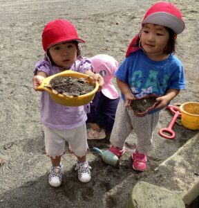 砂遊びをしていると様々な料理を作り始めた子どもたち。お皿に砂を入れ落ち葉や木の実を拾ってきて飾り付けるなどしながら思い思いの料理を作っていました。「ケーキ作った」「アイスできたー」と持ってきてくれたり、友達同士で「美味しいね」などと言いながら食べる真似をしたりと微笑ましい姿が見られました。落ち葉や木の実など秋ならではの自然に触れながら、想像力を膨らませて楽しんでいました。