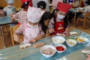 食育「フルーツサンド」を作りでは、パンにクリームを塗って好きなフルーツを置いていきます。「クリームたっぷりにしちゃおう!」「バナナが好きだからいっぱいにしちゃおうかな?」