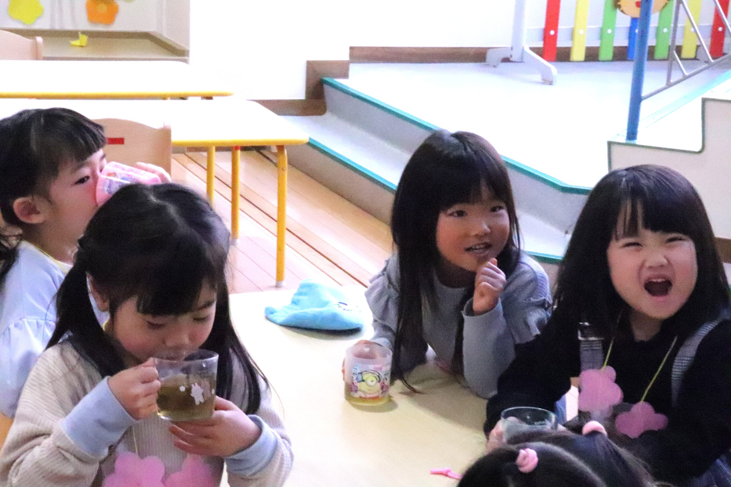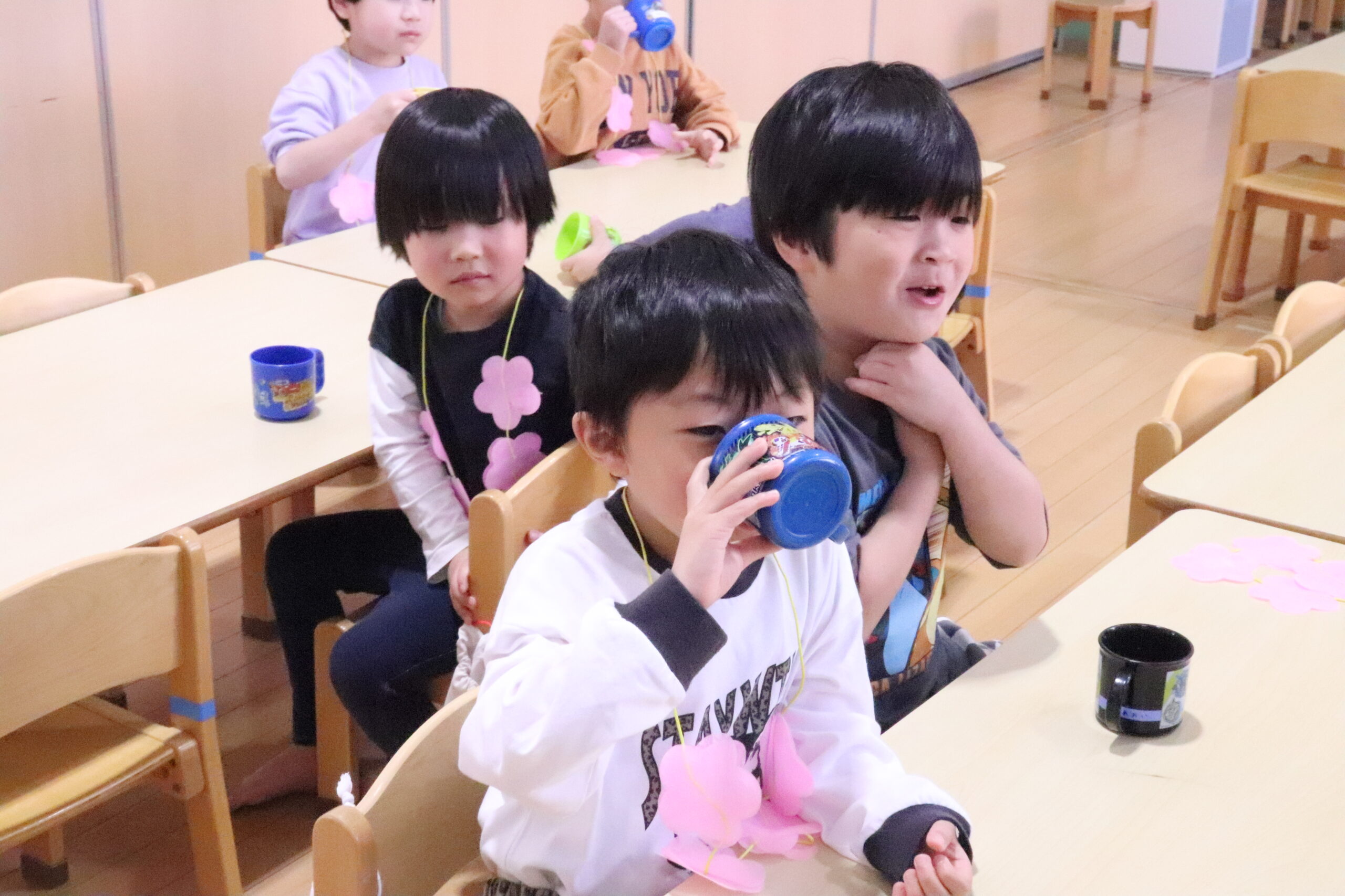 お釈迦様に甘茶を掛けてお誕生日をお祝いをし、好きな色のお花を選んで献花をしました。甘茶を飲むと無病息災で過ごせるという話を聞き、甘茶に興味を持った子どもたち。味見をしてみると「いつものお茶より甘い!」「甘い?苦いんだけど~」「美味しいからこのお茶好き」と、お友だちと話していました。