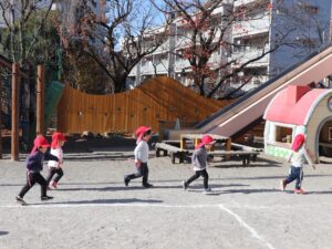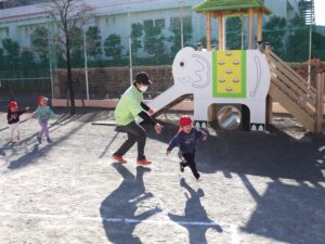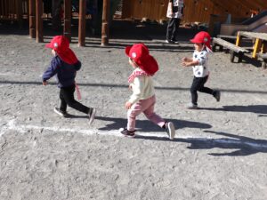 走る、止まる、向きを変えるなど遊びの中で場面に応じて身体を動かして遊んでいました。