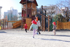 しっぽ取り遊びでは、腰に付けたしっぽを見て、子どもたちはワクワク。「とれたらどうしよう…」「先生のしっぽをとりたい」と、目をキラキラ輝かせ、しっぽが取れた時には、「とれたよ」と嬉しそうに見せてくれました。