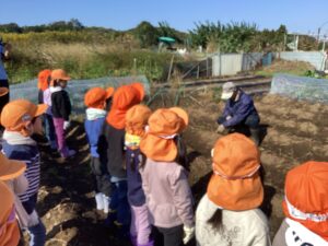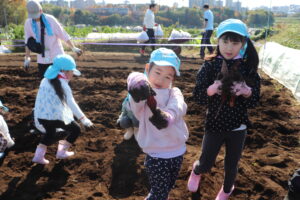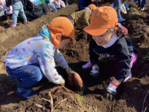 雨で延期になっていた芋ほりを「今度は晴れるかなあ。」とてるてる坊主を作って楽しみにしていた子ども達。願いが叶い、秋晴れの芋ほりになりました。畑につくと、長靴に履き替えタオルを首に巻き、軍手をすると芋ほりのはじまりです!「大きな芋発見!!」「たくさんあるよ!」と泥だらけになりながら夢中になって土をかき分けていきます。収穫した芋は他の学年にもおすそ分けをしました。園では午後のおやつ「スイートポテト」や「芋煮会」で美味しく頂く予定です。ボランティアでお手伝いいただいた保護者の方、ご協力ありがとうございました。