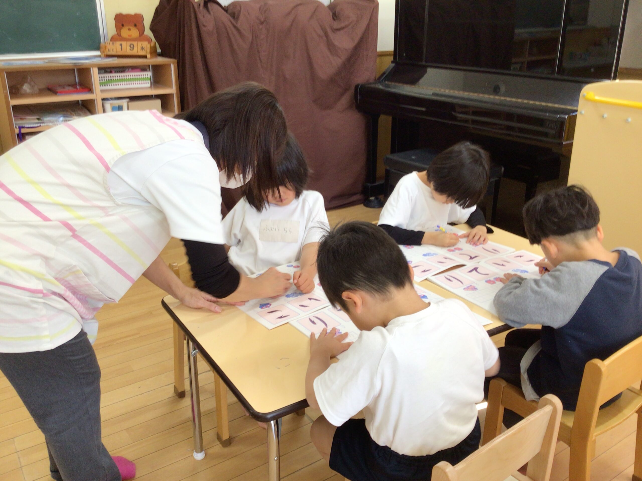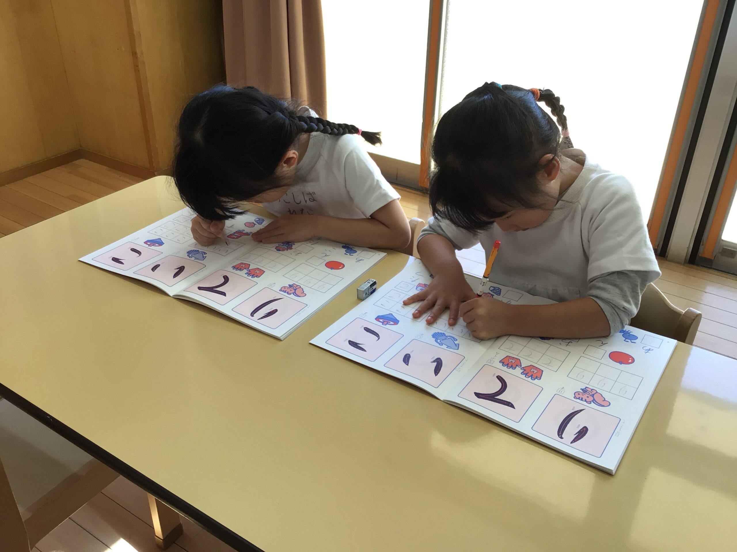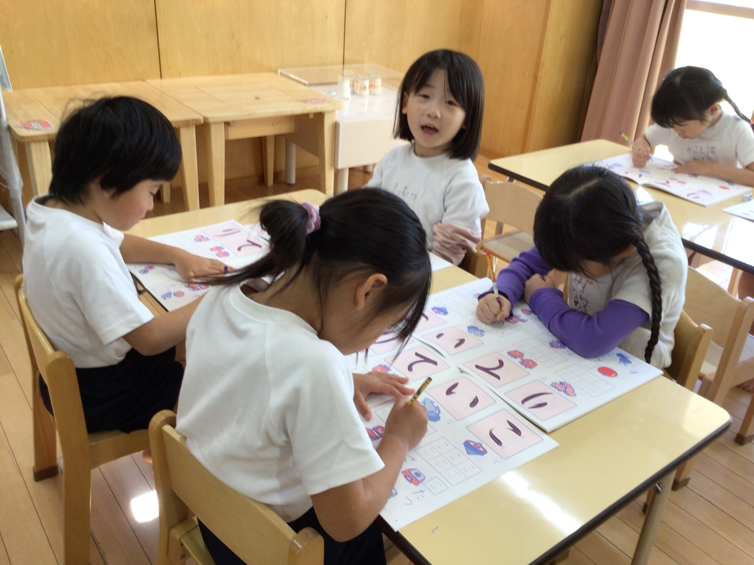 5歳児は小学校就学に向けて、ひらがなワークを使って文字を書く練習をしています。